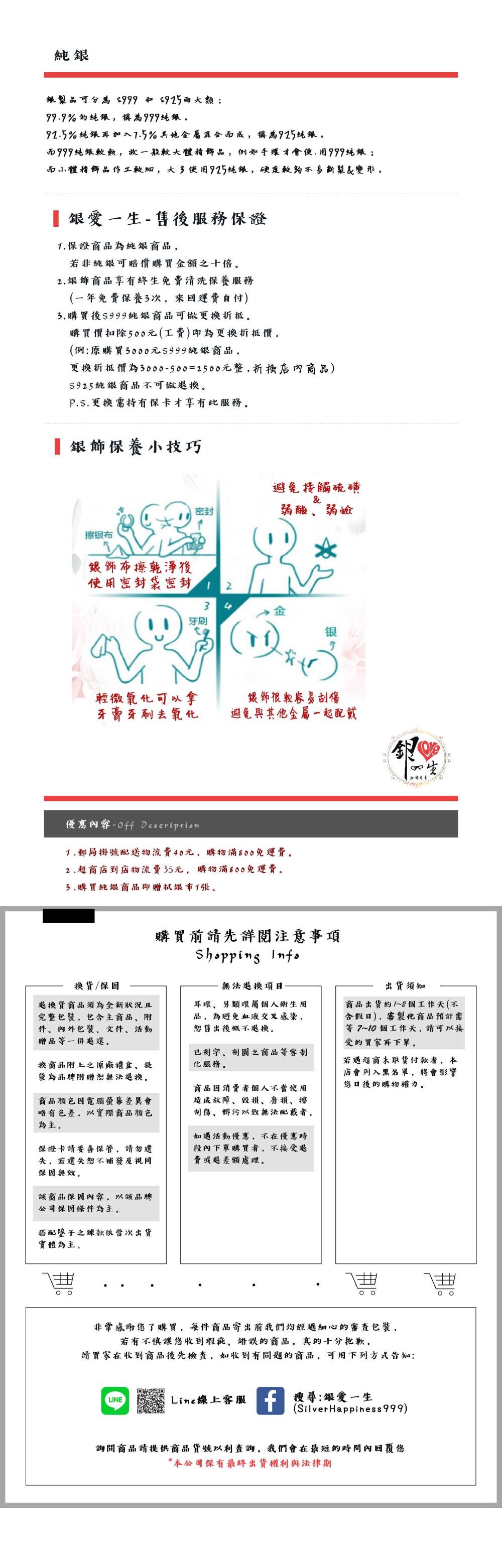 • 鏡面拋光,細緻光滑,金屬部分皆為925純銀,敏感肌膚均可安心,配戴舒適