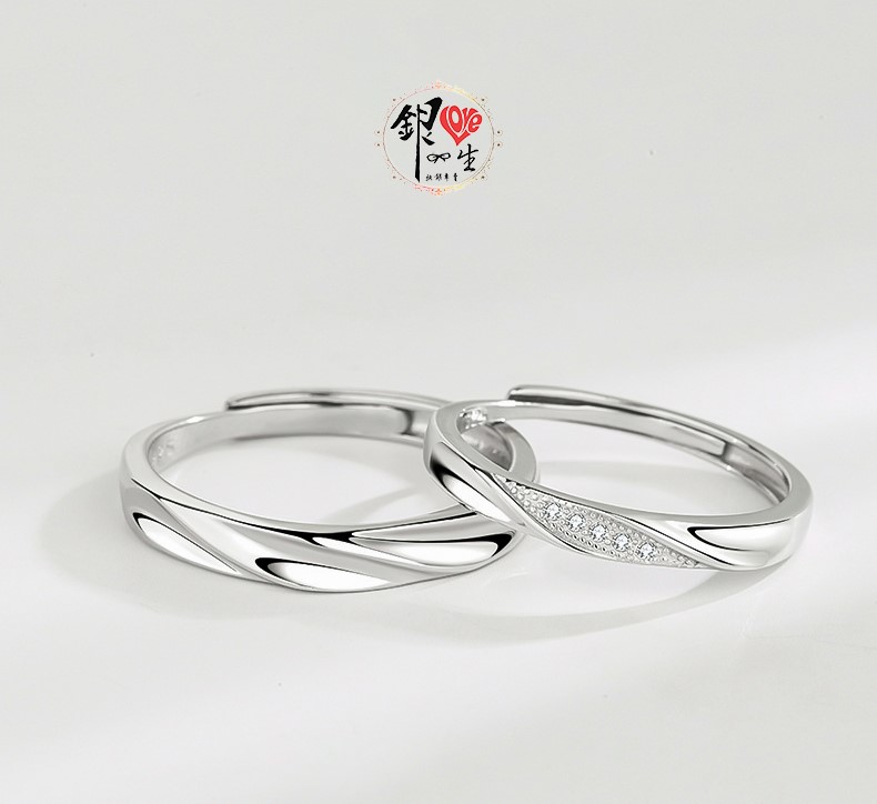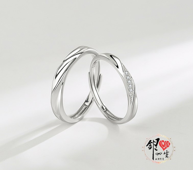 此款情侶戒指做成紐紋造型,以優質鋯石點綴於女戒款,