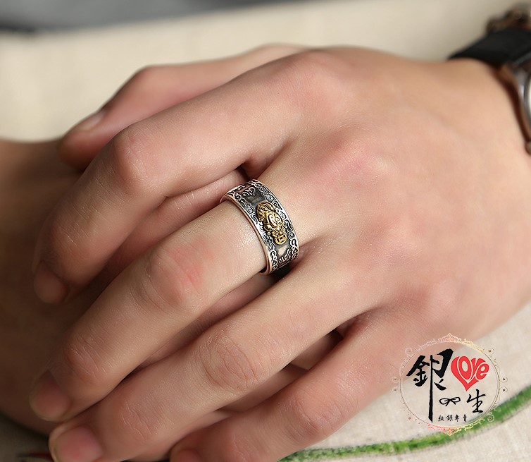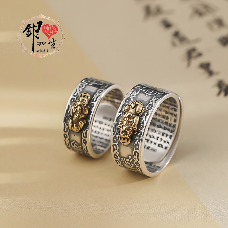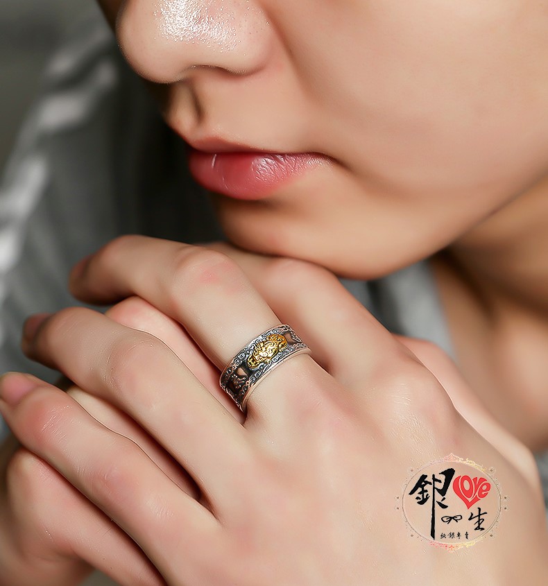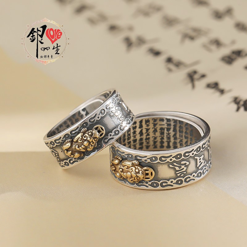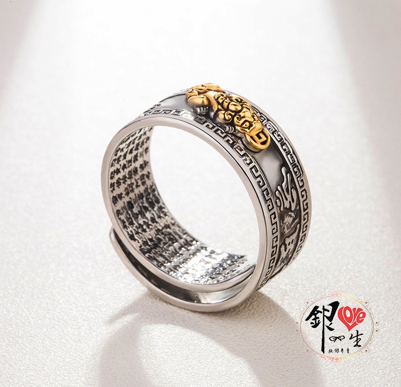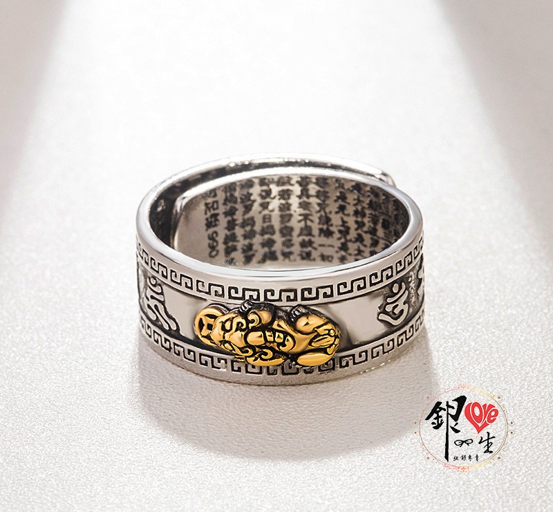 六字箴言搭配鍍有黃金的貔貅,招財及帶來吉祥如意之美寓 戒指內側為心經,讓心境平和。
